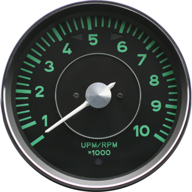 115mm electronic tachometer available in 8K or 10K scale. Black dial with green print and centre embellishment. Also available with green dial with black print. Full V black and chrome bezel. White internal illumination.12V