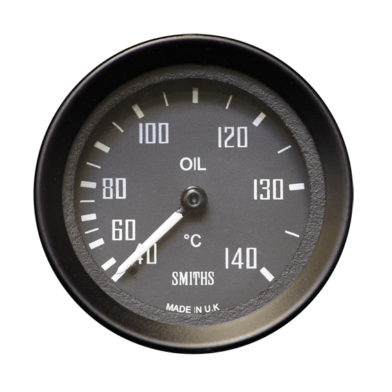 Smiths Classic 52mm (2in) dashboard fit gauge for the GT40. Black dial with white print and black half V bezel. 0-140°C. K type bulb.