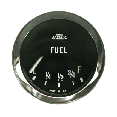 52mm Fuel level gauge with black dial and choice of half ‘V’ black or chrome bezel. ‘E, 1/2 F’ ‘Fuel’ and British Jaeger Logo on dial.
