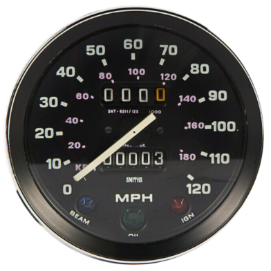 100mm speedometer with black dial, white MPH and lilac KMH print, white pointer. 3 warning lights, floodlit illumination.