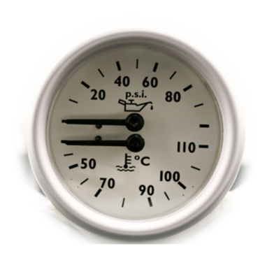 52mm Dual Oil Pressure / Water Temperature gauge with 20 inch capillary A2 Bulb and 1/8 BSP pressure connection. Available in cirrus white, magnolia mint green or black dial, with anodised aluminium bezel. No Logo.