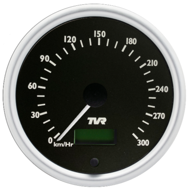 Electronic 100mm (4in) dashboard fit speedo for TVR Cerbera, Griffith and Chimaera with LCD odometer front reset, trip and total function. This speedometer is programmable and has the ability to accept PPU number or has a ‘Drive To Set’ function. Available in a range of scales with black, mint green magnolia or cirrus white dial.