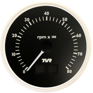 Electronic 100mm (4in) dashboard fit 0-8000 RPM for TVR Cerbera, Griffith and Chimaera. With warning lights and solid logo. Available with black, magnolia, mint green or cirrus white dial. This tachometer is programmable for number of cylinders