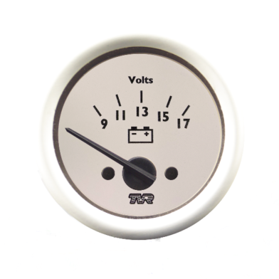 52mm Voltmeter with half round aluminium bezel. Available with Black, Magnolia, Mint Green or Cirrus White dial. 9-7 volts