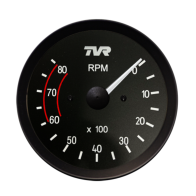 80mm 8K Tachometer for the TVR S4 with half ‘V’ black bezel and black dial. Red sectors at 6K to 8K