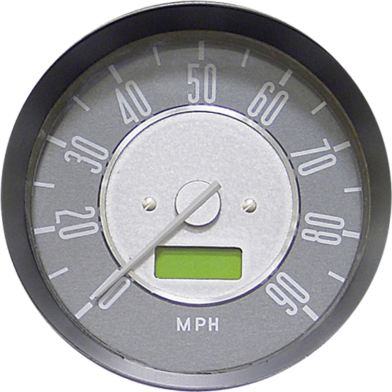 VW 120mm digital bay-window type speedometer with grey dial and inner silver centre. Instructions and templates supplied to existing panel, odo or trip readout, onboard “drive-to-set” programming, available in Mph and Kmh,