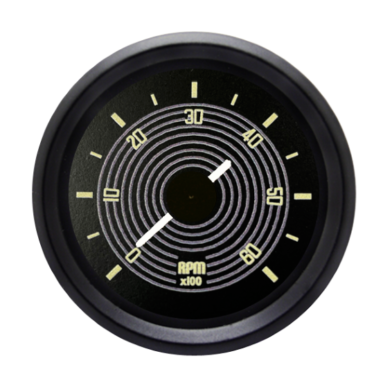 52mm stepper tachometer for the VW beetle with black dial and full ‘V’ chrome or black bezel. 0-6000 RPM. 12V