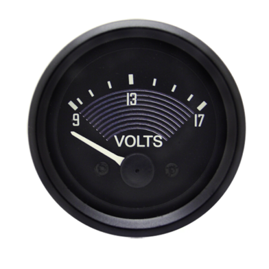 Classic 52mm voltmeter for the VW Beetle. Black dial with full vee black or chrome bezel. 12V, Scale 9-17volts