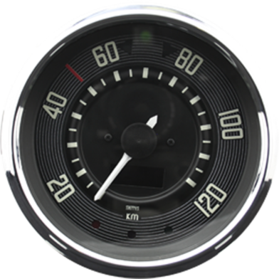 Smiths VW Type1 115mm digital speedo wth black dial and chrome bezel. Original dashboard fit for type 1 Beetle. With odometer or trip readout, indicator, high beam, oil pressure and charge warning lights. “Drive-to-set” programming. Available in Mph or Kmh versions.