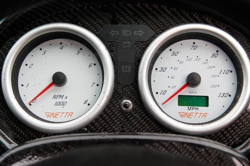 The instrument set comprised of an 80mm 0-180MPH Speedometer and matching 8K Tachometer and featured white dials encased in a half round aluminium bezel, customised graphics, red pointer and the orange Ginetta Logo.