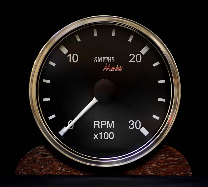 The new 100mm tachometers feature stainless steel bezels, black dial faces are LED backlit and illustrate the distinctive SMITHS Marine Logo. They measure Revolutions in the range of 0-3000 RPM. A similar Tachometer featuring chrome bezels was also designed.