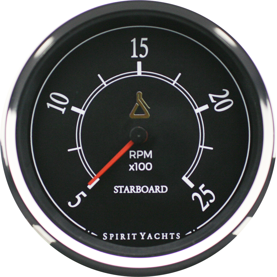 The three instruments designed and manufactured consist of a 12 volt 100mm tachometer measuring 500-2500 revolutions per minute. The gauge has a classic styling with black dial, digitally printed white font and rover red pointer blade. A full vee stainless steel bezel encloses the gauge in its plastic waterproof case. The signature Sprit Yachts Logo and trademark is featured and the gauge is LED illuminated.