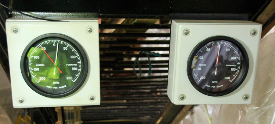 The gauges measure the revolutions-per-minute of the two fixed-pitch shafts driving the propellers, with one white needle registering forward movement and a second red needle registering backward motion. Ā Measurement occurs via an indexed toothed wheel fixed on the each shaft. Ā With the challenging marine environment, each gauge is designed to be resilient in the marine environment and to withstand the vigours of life at sea. They are also LED back lit for display clarity.