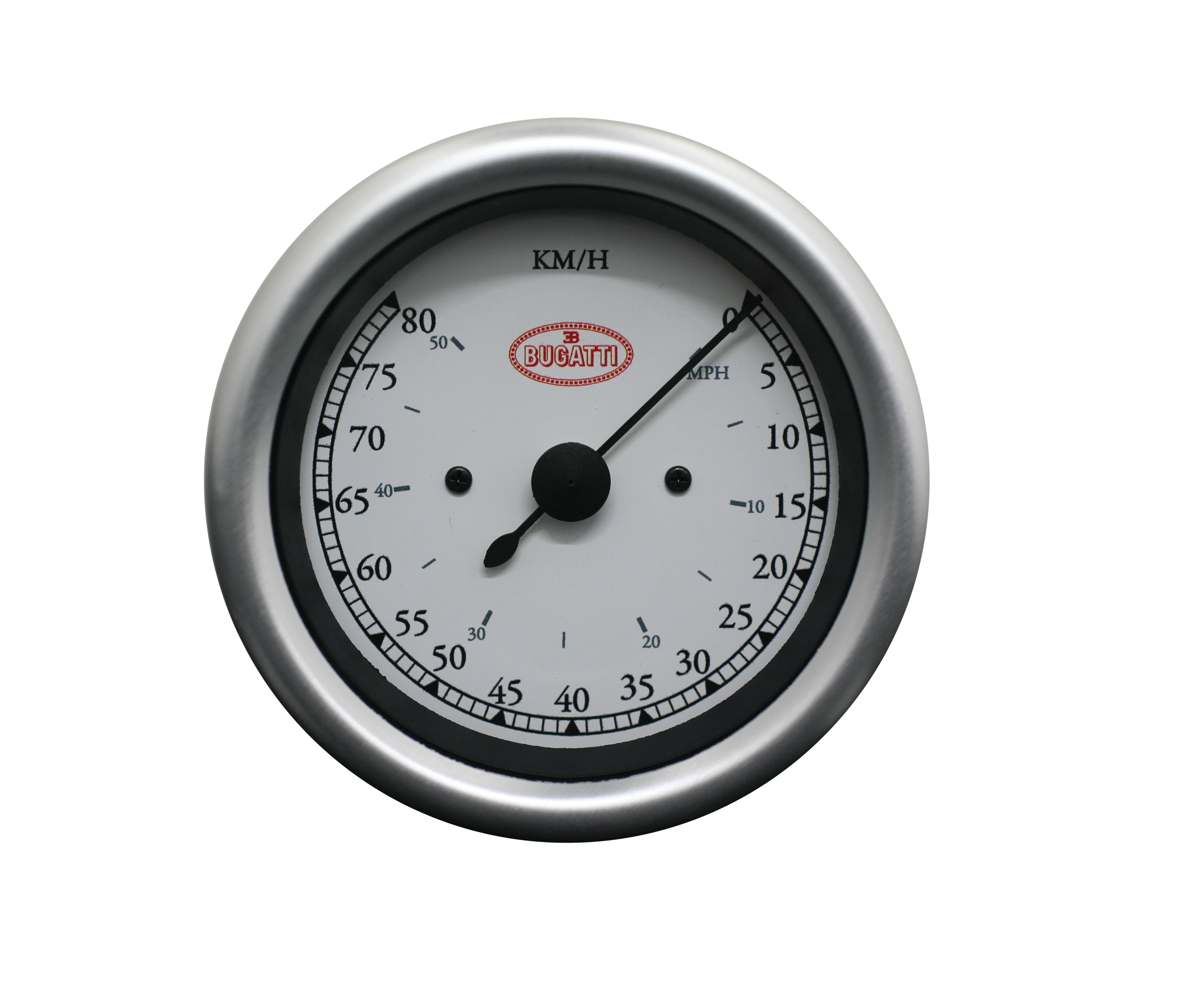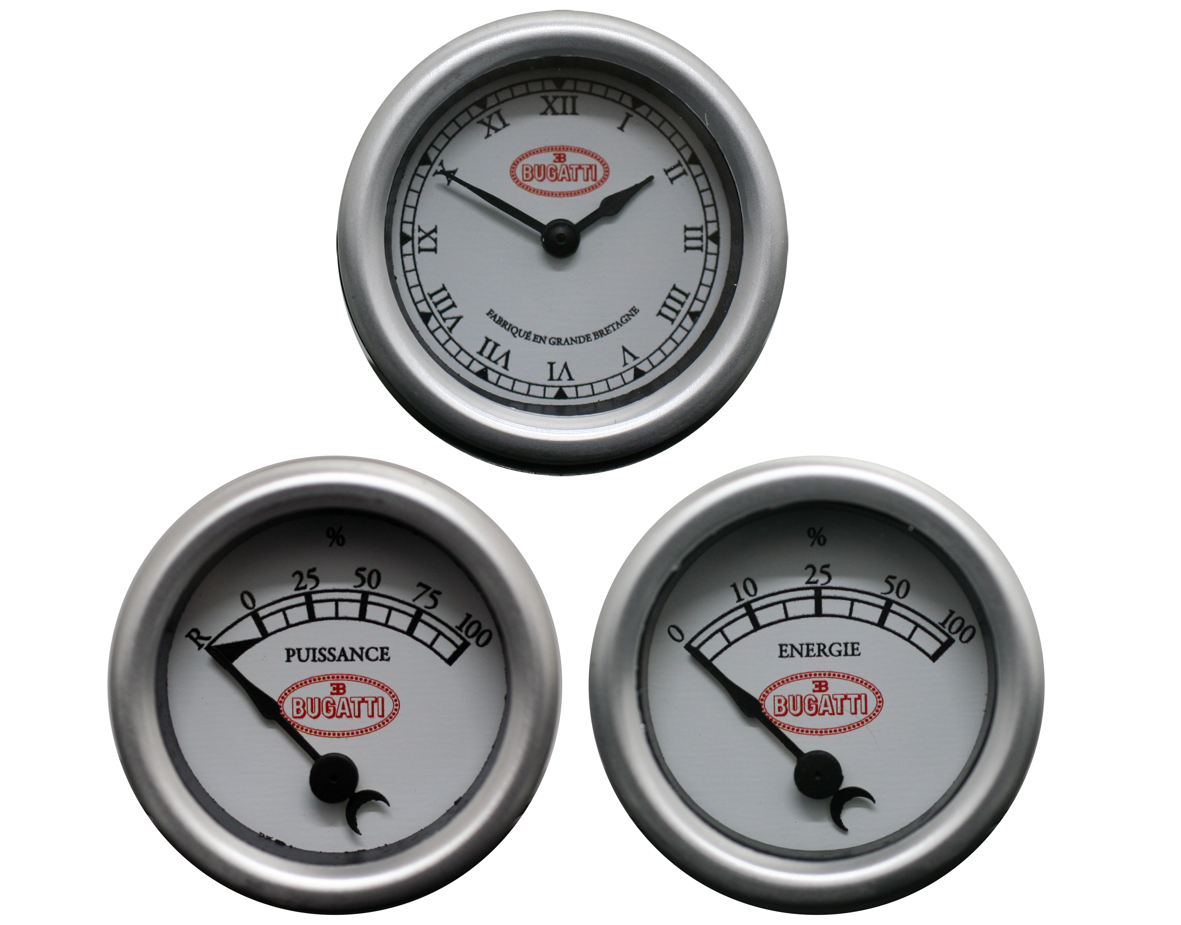 The instrument set consists of 80mm dual scale speedometer measuring speeds from 0-80Km/h (0-50 MPH), 52mm illuminated time clock, 52mm power meter and Battery Meter. All gauges are CAN enabled and feature white dials with black print, black pointers, half round aluminium bezel and the BUGATTI red logo.