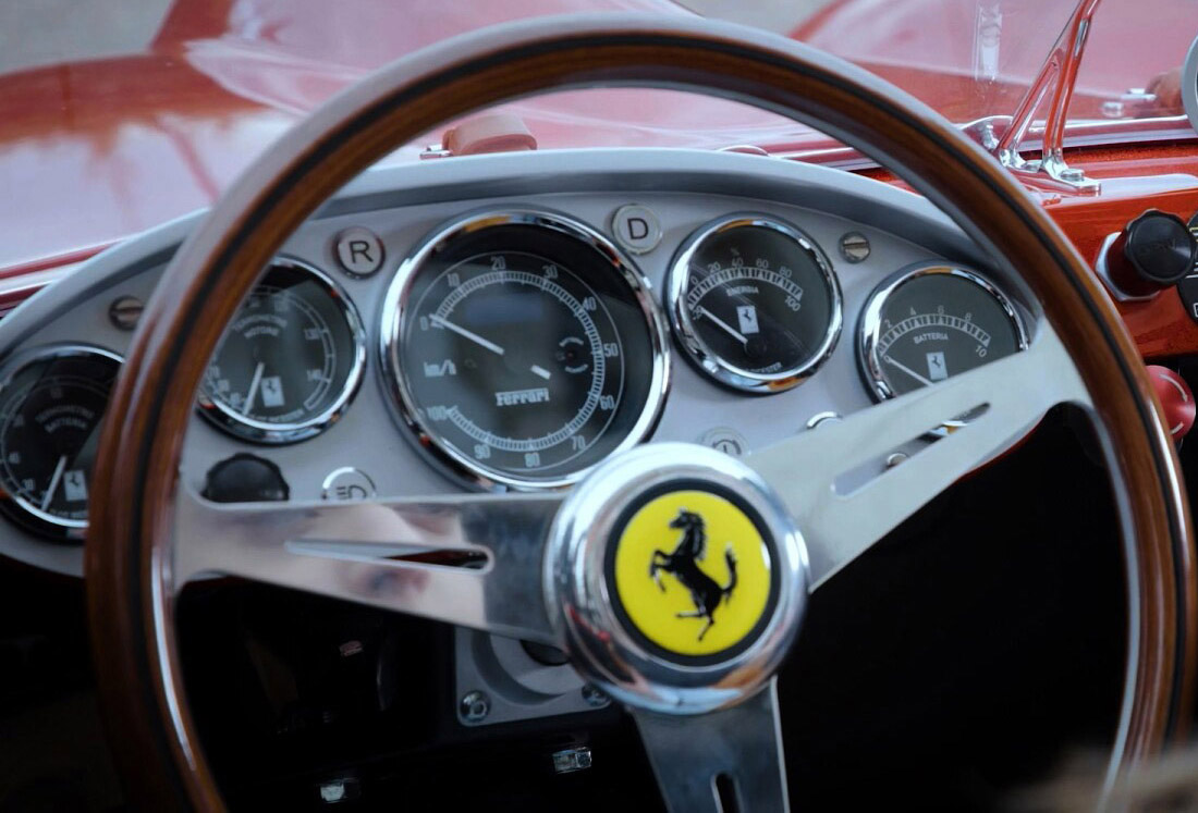 The speedometer, which is centred and is the main focal point of the dashboard, completes the set. It features a battery warning light and LED illumination. All CAN bus (Controller Area Network) enabled gauges feature black dials with white print, chrome bezels, original fonts and the distinctive Ferrari trademark or Ferrari logo.